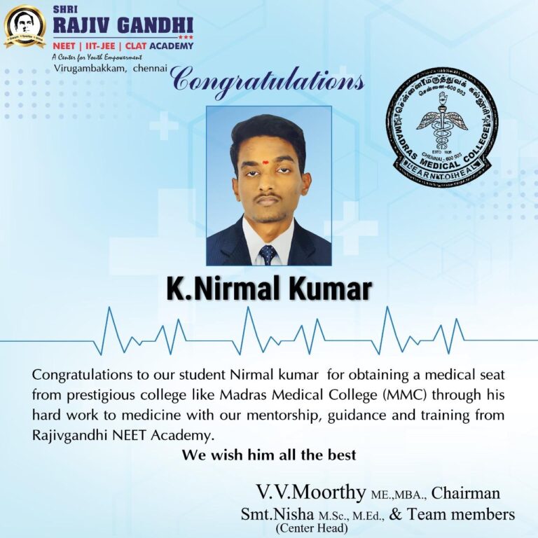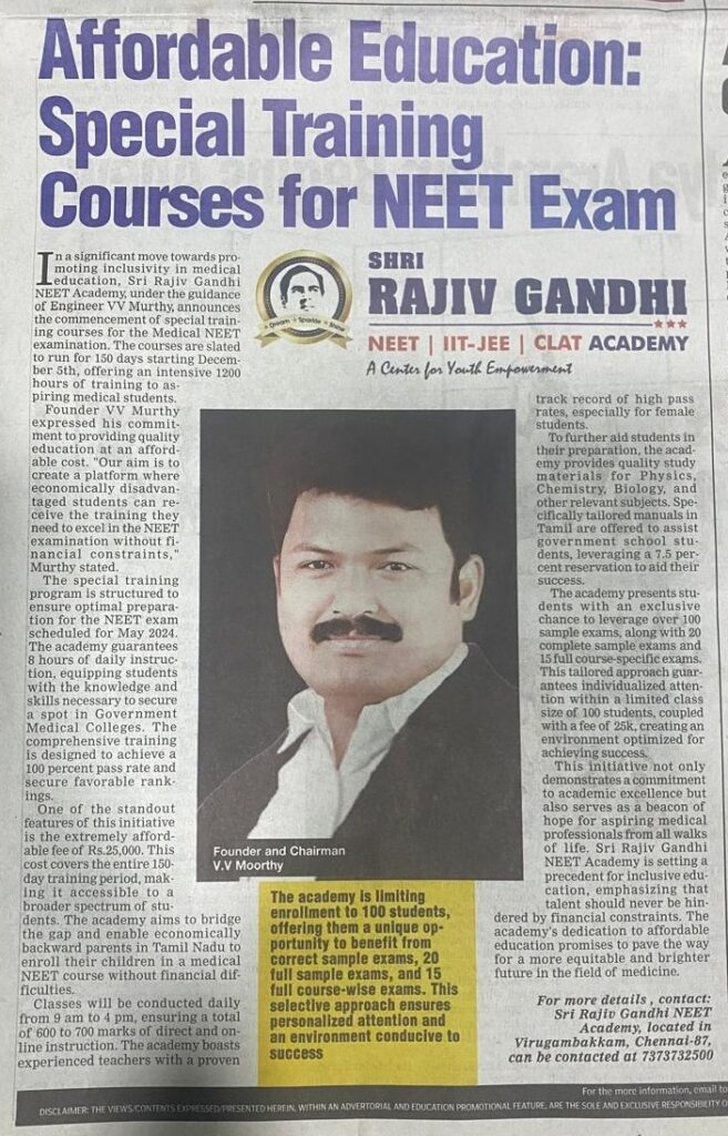 SRG Shri Rajiv Gandhi Academy was founded with a clear mission by Mr. V. V. Moorthy, a visionary educator and native of Krishnagiri, Tamil Nadu. His dream is simple yet powerful:no student should miss an opportunity to achieve their dream due to financial constraints. With a deep passion for service through education, he established the first SRG Academy campus at Anna Nagar, Chennai – 600040,to provide affordable, high-quality coaching for NEET, JEE, and other competitive entrance exams.